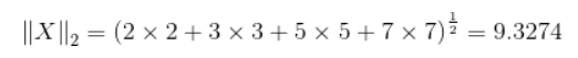 例:向量X=[2, 3, -5, -7] ,求向量的1-范数,2-范数和无穷范数。